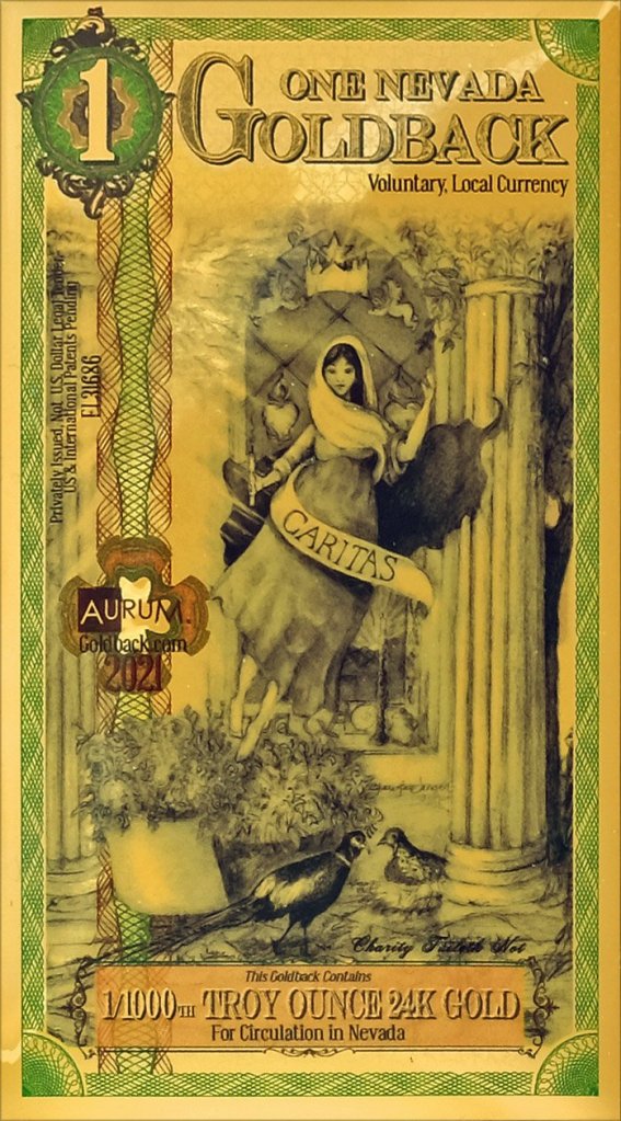 Well, today, dear brothers and sisters, I have the pleasure of introducing you all to the “Goldback” (https://www.goldback.com). Goldbacks are similar in concept to banknotes, such as the Federal Reserve note known as the US dollar, however, they are not paper (fiat) currency. Rather, goldbacks are described as the “world’s first physical, interchangeable, gold money, that is designed to accommodate even small transactions”. And when talking about small transactions, this is a literal description, because today’s value of one goldback is about USD $3.90 (about the cost of a cup of coffee). It solves the problem of making gold easily spend-able and useable for actual barter. They look similar in size to banknotes, such as the US dollar. However, they have small increments of gold actually embedded within the note. So, they are definitely NOT any type of paper currency. They hold intrinsic value because they consist of actual gold!