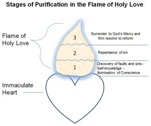“I have come to describe to you the Flame of My Immaculate Heart – the Flame of Holy Love – The First Chamber of Our United Hearts. There are different compartments or chambers, if you will, within this Flame. The first and most intense area of this Flame is for souls just beginning to discover their own iniquities. Many spend long years in this part of the Holy Flame, for pride does not permit them to admit their own guilt and weaknesses.”