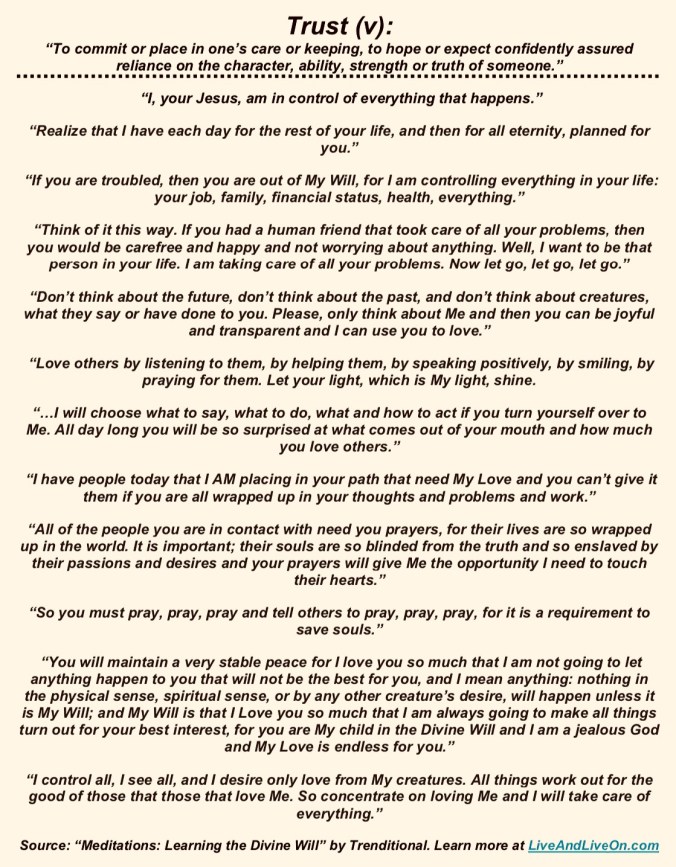 “Therefore, do not place human limitations on My Power. Neither should you refuse to accept My decisions in your life. Every sacrifice – offered with love – is worthy of changing hearts, protecting those in danger, revealing evil, and bringing victory out of defeat. The most important thing to remember, is My Will balances all things out to bring souls to their salvation.”