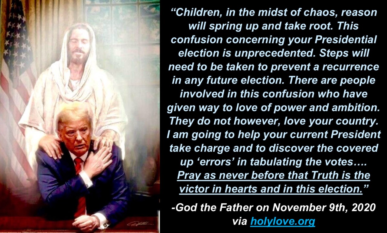 Last night, Jesus told me that it is URGENT that everyone pray to Papa God for a MIRACLE for Donald Trump to take place by Christmas. Otherwise, if the vote goes to the House, Biden would win, and the American people would begin to lose confidence in the U.S. Federal government, because everyone would feel that their votes were robbed and a grave injustice would have taken place. Jesus shared with me that our form of government would be DONE, as in finished, and there would be chaos, civil unrest, and martial law declared. And the violence would escalate until January 20th, when the inauguration would be supposed to take place for the next president. I do not normally see visions, but God permitted me to hear the sounds of all the chaos and violence happening as my country would unravel into civil war. It was really, really bad to hear.
