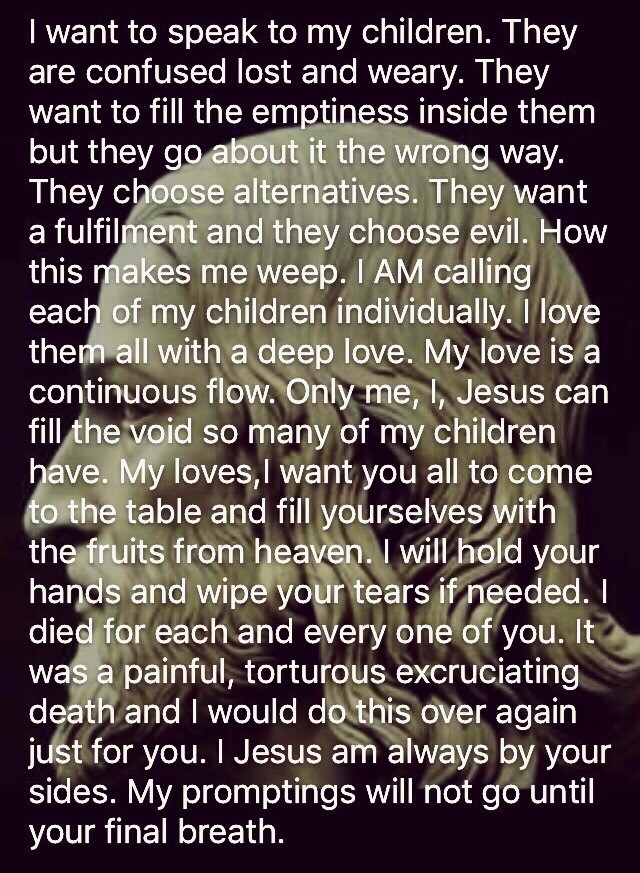 You need me. All this world does is reject my words. All I want children is for you to live in peace. To love your neighbour as yourself.