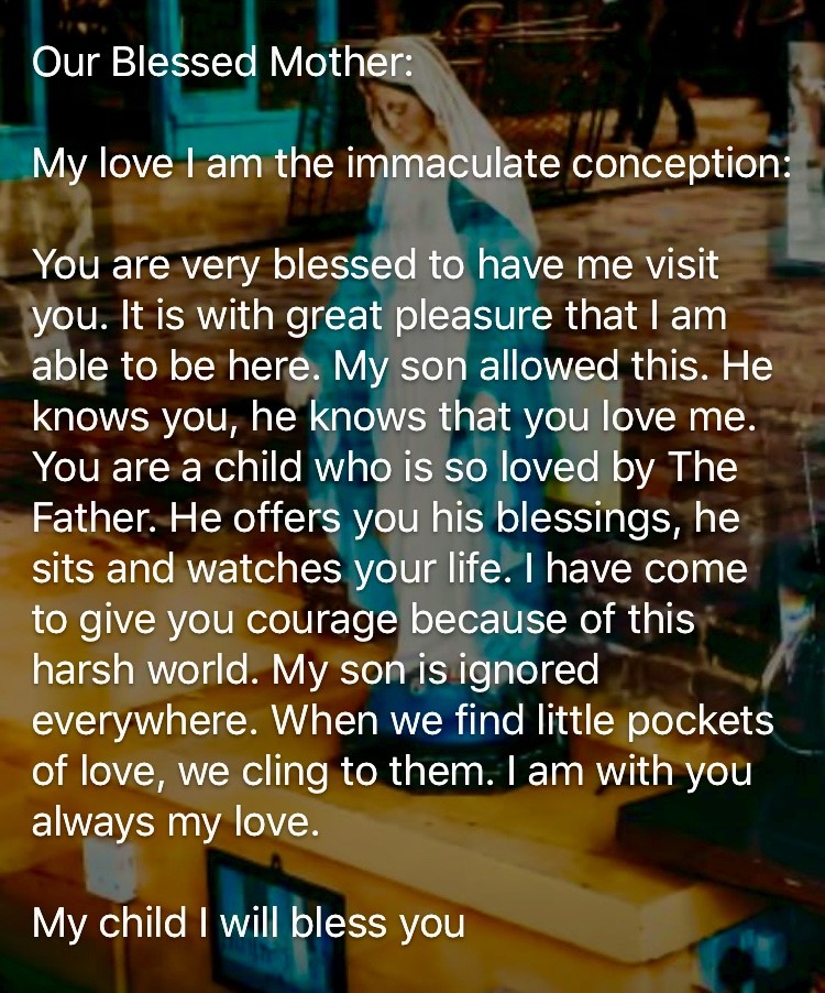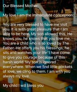 If you are Catholic you must go back to my sacraments. I await everyday for your arrival in my house. I can wait. You must receive me in the Blessed Sacrament but I want you to have my blessing and forgiveness in the confessional box before this very special place of my love. ‘My love’ being the body of Christ. It is my offering to you all. I suffered for my children. Please believe the words I place in my prophet’s mouth.