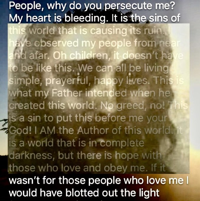 My love, I am Jesus born incarnate. See my child. I didn’t let him win. He is a pathetic creature, but also very clever. He has this world in the grip of his palm. He does not want these messages to spread.