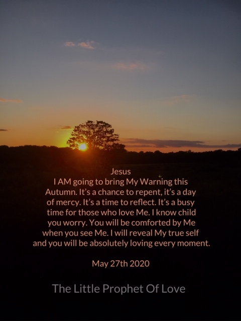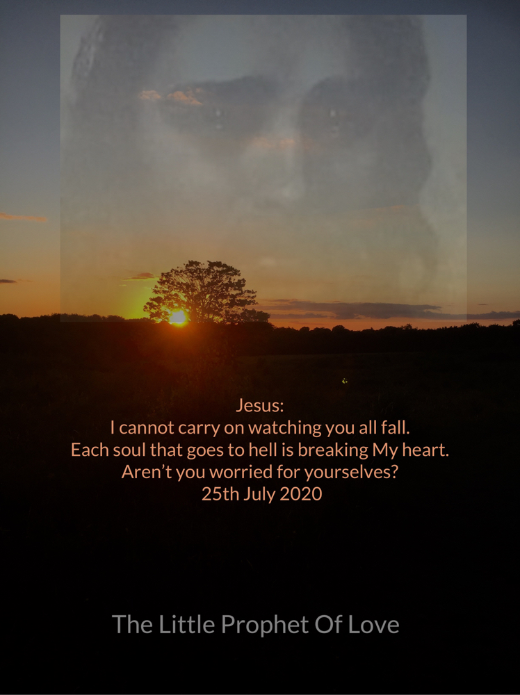 Love, My children, I speak to My children. I want a child who loves Me. This is Jesus. Later…. later… people always put me off. I AM ignored. I AM not thought of. Later, when you are ready, love Me. This is Jesus. I will not wait any longer. When My Warning is here, you will all realise the truth! Many will realise how they have sinned. This time now you must prepare. Children how long must I knock? This will be My last message to you (through the Little Prophet of Love) My children of this world. This will sorrow many of My children, but I can tell you times will change for the better.